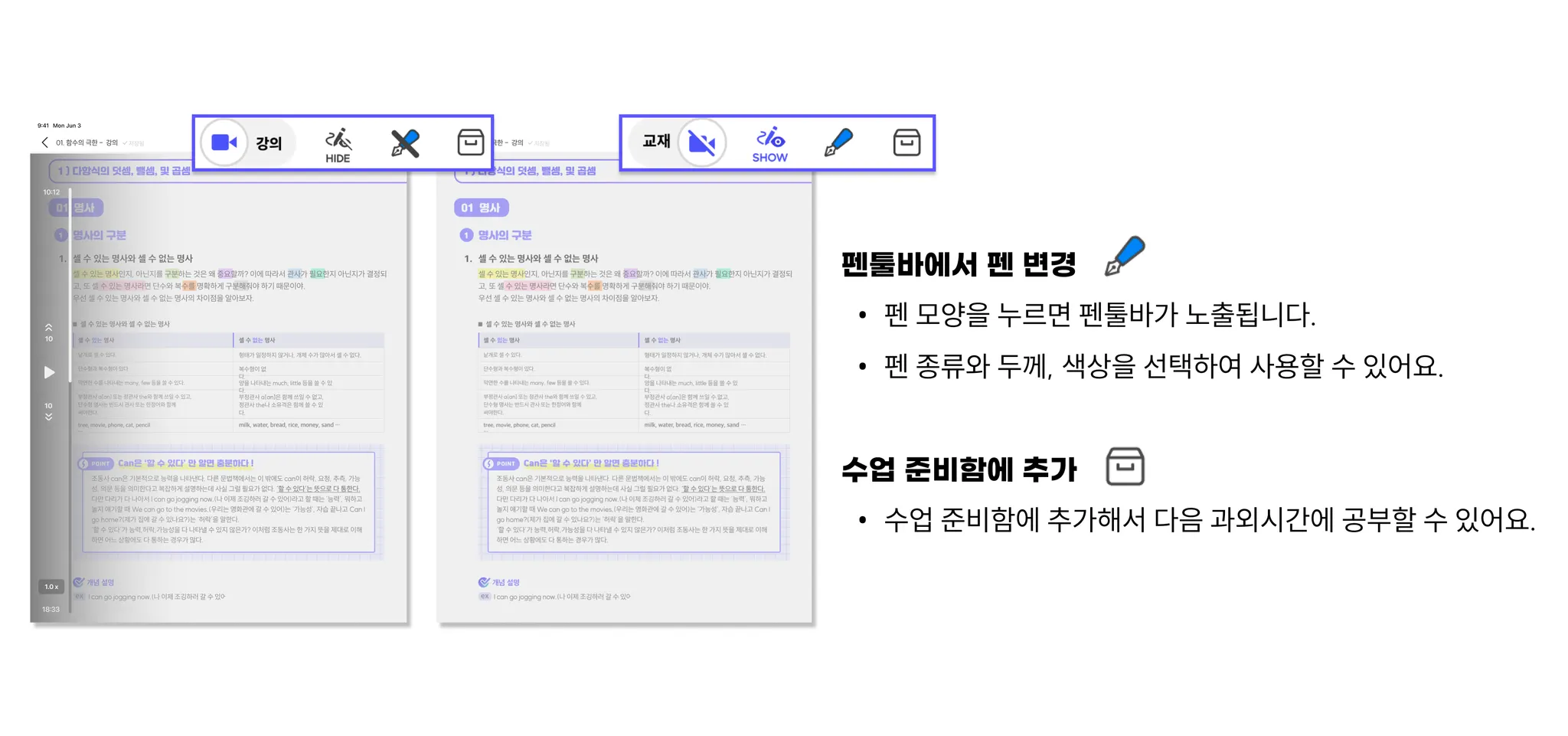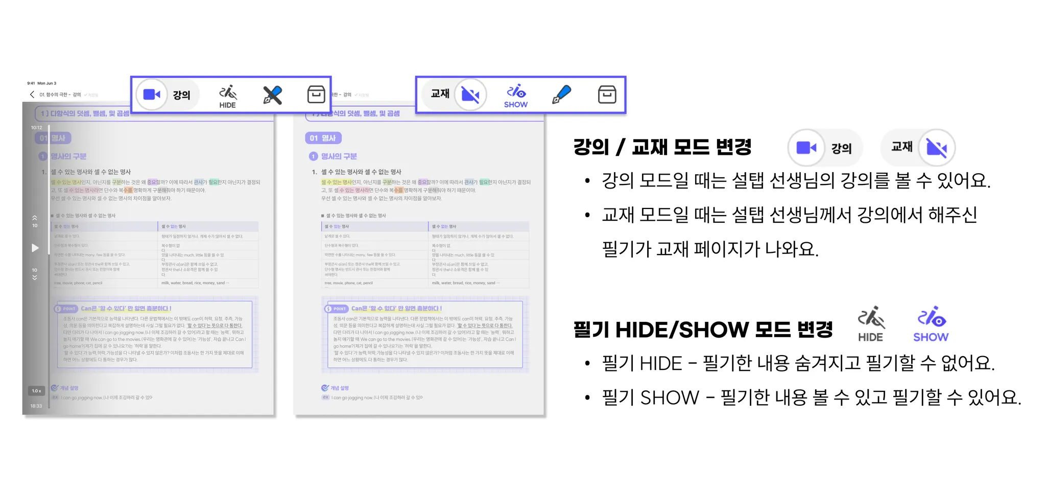 개념강의에서 [강의모드]와 [교재모드]를 활용하여 스마트 강의를 100% 활용할 수 있어요.