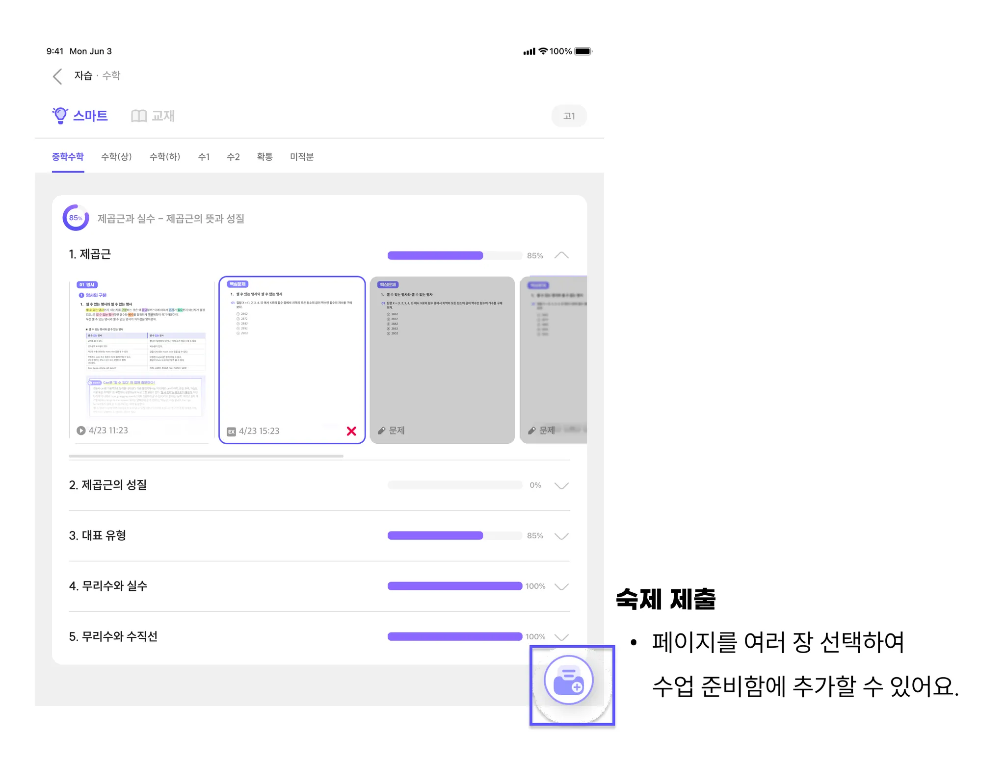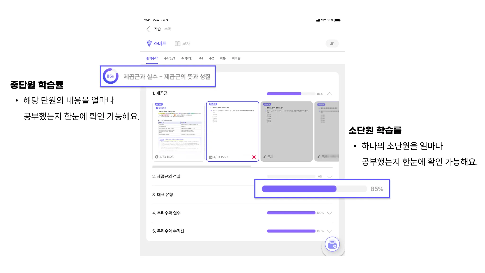 스마트 메뉴에 들어가서 공부하고 싶은 과목을 선택하면 얼마나 공부 했는지 확인할 수 있어요.