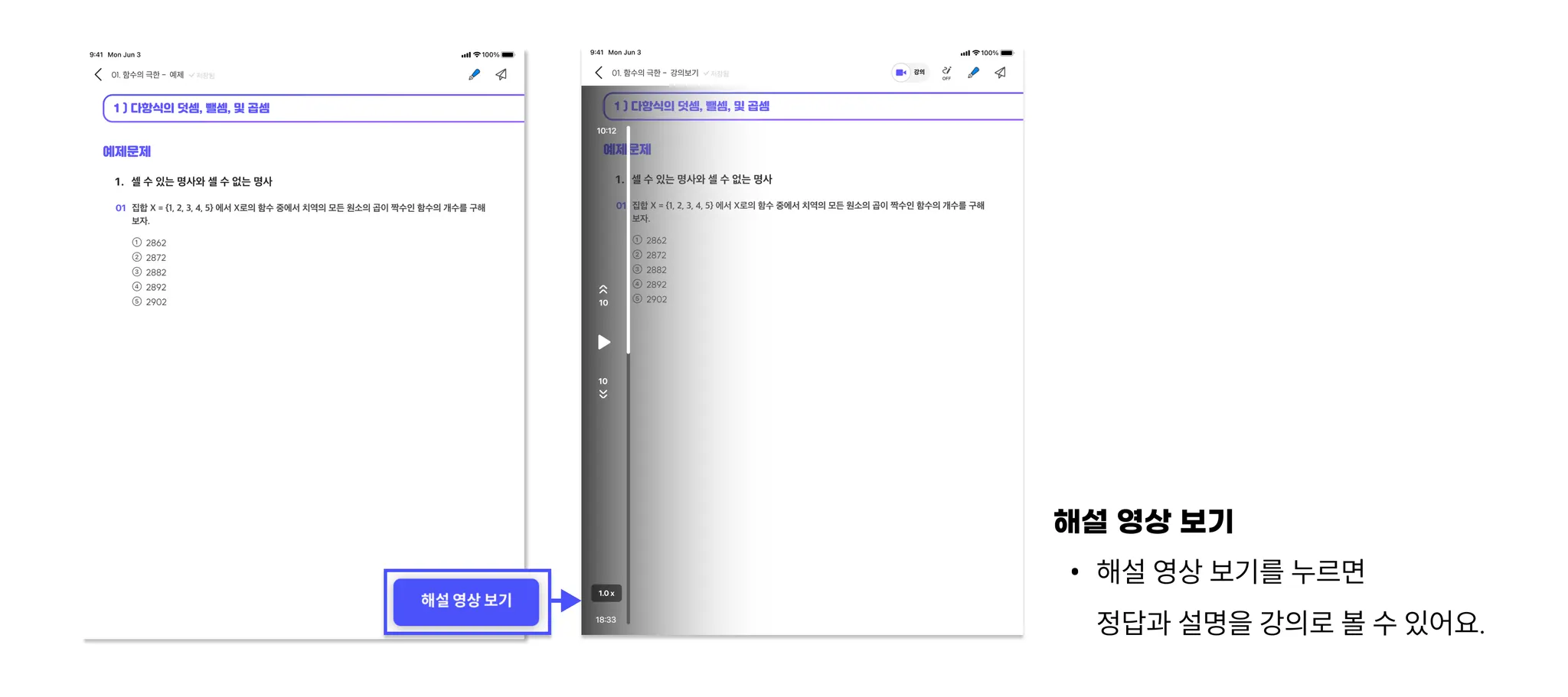 개념을 활용해 예제에 적용해보세요. 예제 해설 영상에서도 강의에서 제공하는 기능을 모두 사용할 수 있어요.